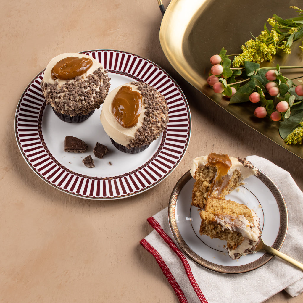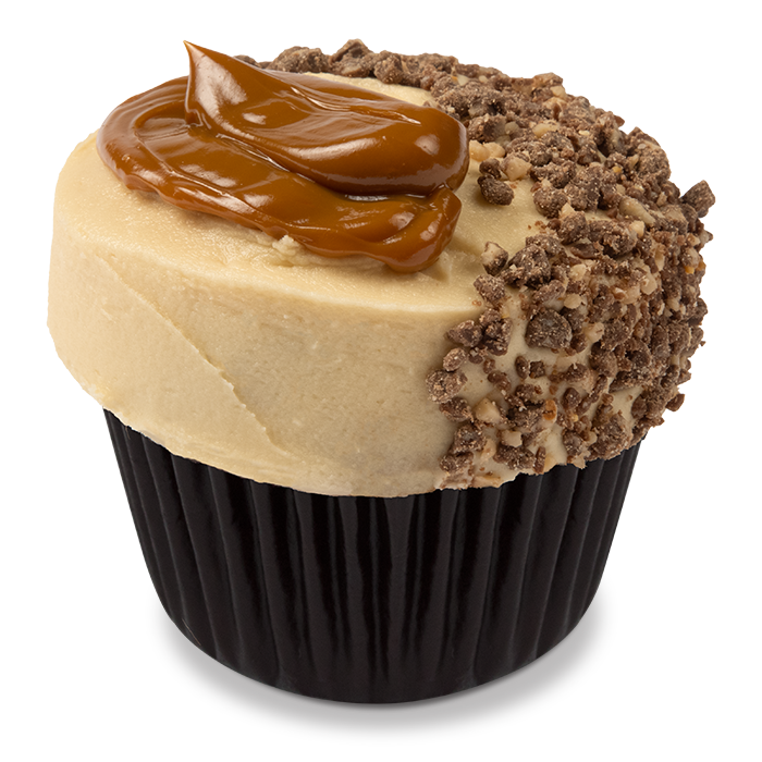 Our Sticky Toffee cupcake is back and sweeter than ever. Bite into sticky toffee cake with a gooey caramel center, topped with date-infused buttercream, and finished with crushed chocolate toffee crumble and caramel sauce. It's a caramel lovers' dream!
